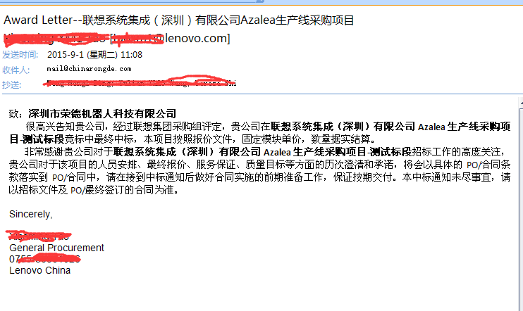 很高興告知貴公司,經(jīng)過聯(lián)想集團(tuán)采購組評定,貴公司在聯(lián)想系統(tǒng)集成(深圳)有限公司Azalea生產(chǎn)線采購項(xiàng)目-測試標(biāo)段競標(biāo)中最終中標(biāo),本項(xiàng)目按照報(bào)價(jià)文件,固定模塊單價(jià),數(shù)量據(jù)實(shí)結(jié)算。