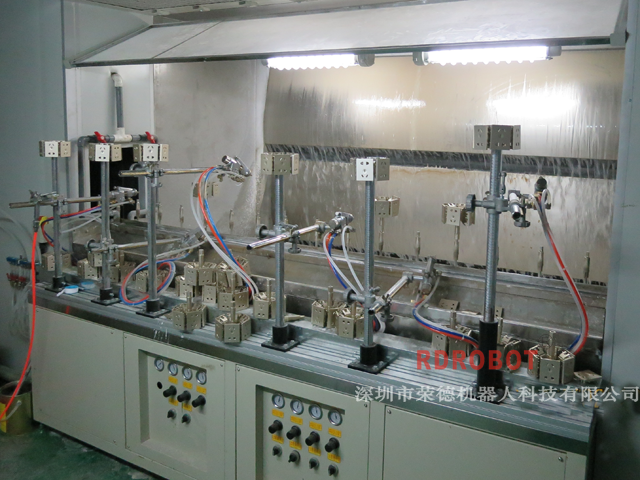 固定噴槍線體和spindle線是同一種,把噴槍固定在線體邊,依靠產(chǎn)品自轉(zhuǎn),適應(yīng)體型小且可找到合適的夾具支撐的產(chǎn)品。一般線體會(huì)安裝多把噴槍,當(dāng)產(chǎn)品輸送噴槍旁邊,噴槍才會(huì)送漆。
