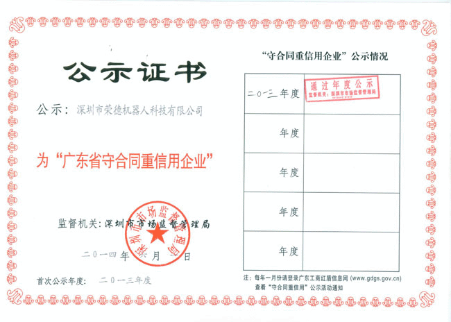 在此之際,非常感謝廣大客戶朋友對公司的認(rèn)可和滿意,只有客戶對公司的認(rèn)可,這樣公司合同才能夠嚴(yán)格履行,最終才能獲得該榮譽稱號。全體榮德人將會以此為契機,將產(chǎn)品質(zhì)量和服務(wù)做到行業(yè)內(nèi)一流水平,滿足并不斷超越客戶需求。同時也請客戶放心選購我司的噴涂機器人、自動噴涂設(shè)備、自動化生產(chǎn)線,獲得“廣東省名牌產(chǎn)品”的“守重企業(yè)”值得您的信賴,我們將會以最優(yōu)質(zhì)的質(zhì)量回報客戶、回報社會,為深圳質(zhì)量的發(fā)展乃至全國質(zhì)量的發(fā)展貢獻自己的力量!